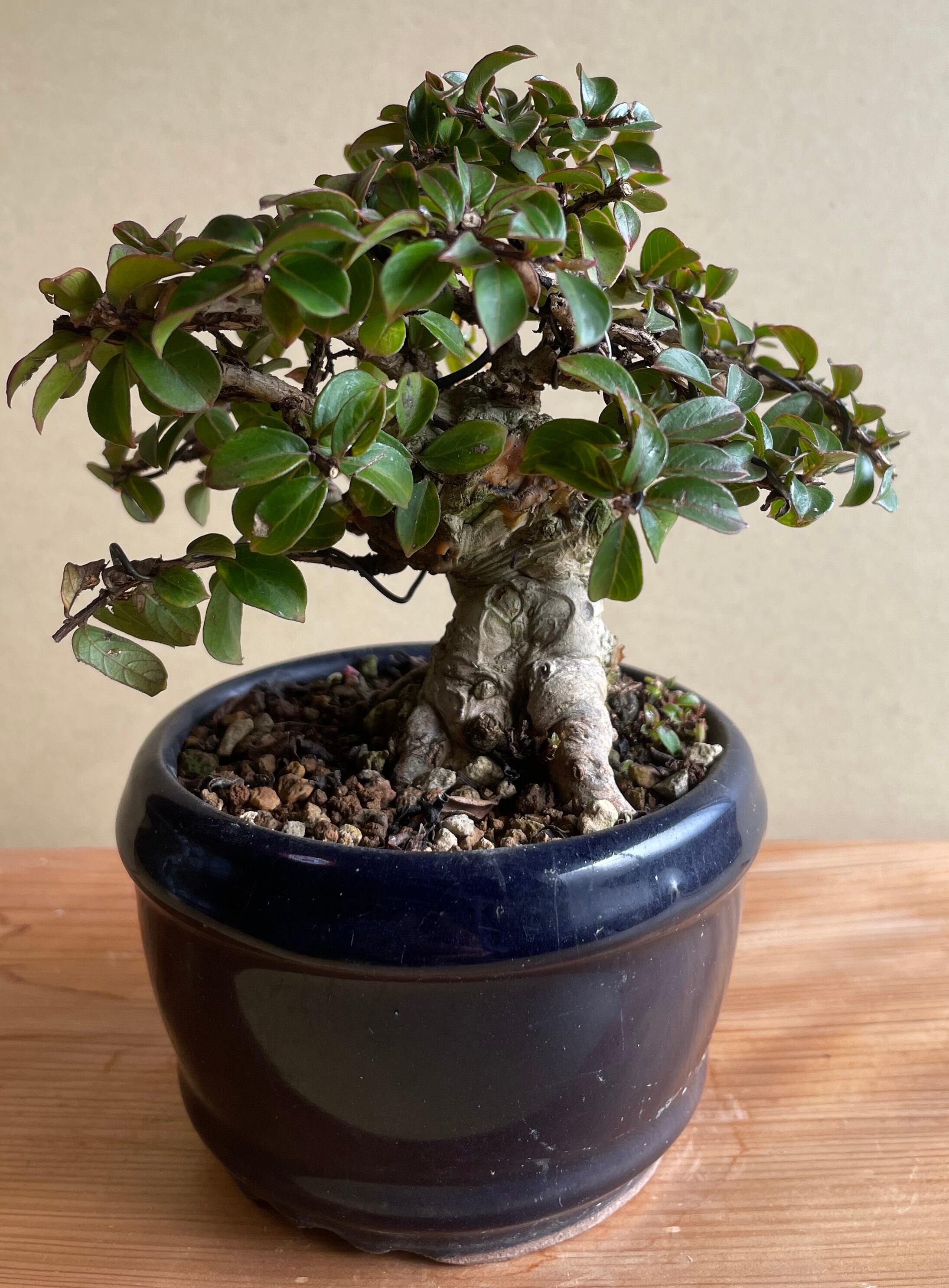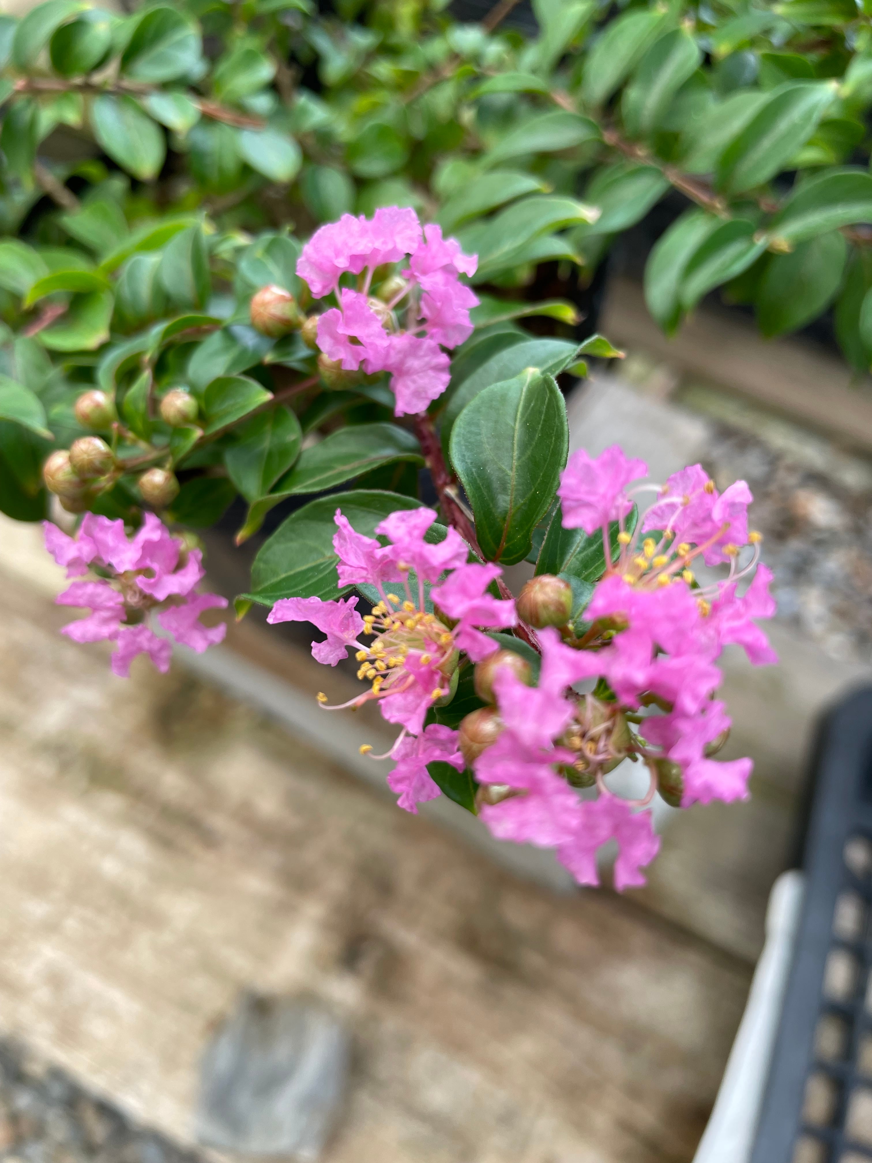 樹高10cm、木幅12cm、太幹の姫サルスベリ盆栽です。5月ごろから枝が伸び、その先に8月ごろにピンクの花が咲きます(2枚目が花の写真です)。冬は落葉し、4月ごろ芽吹きます。裏面(3枚目の写真)を正面としても良いです。