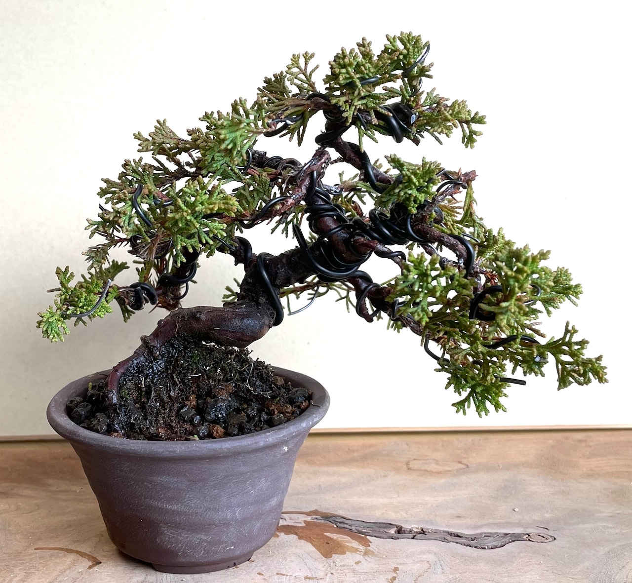 樹高10cm、木幅15cm、糸魚川真柏の盆栽です。幹も枝も捻転し、小さいながらも躍動感があります。幹の彫刻は行っていないので、ジンシャリを作っていく楽しみもあります。もちろんそのままの形をお楽しみいただいてもいいかと思います。夏の暑さ、冬の寒さに強いです。