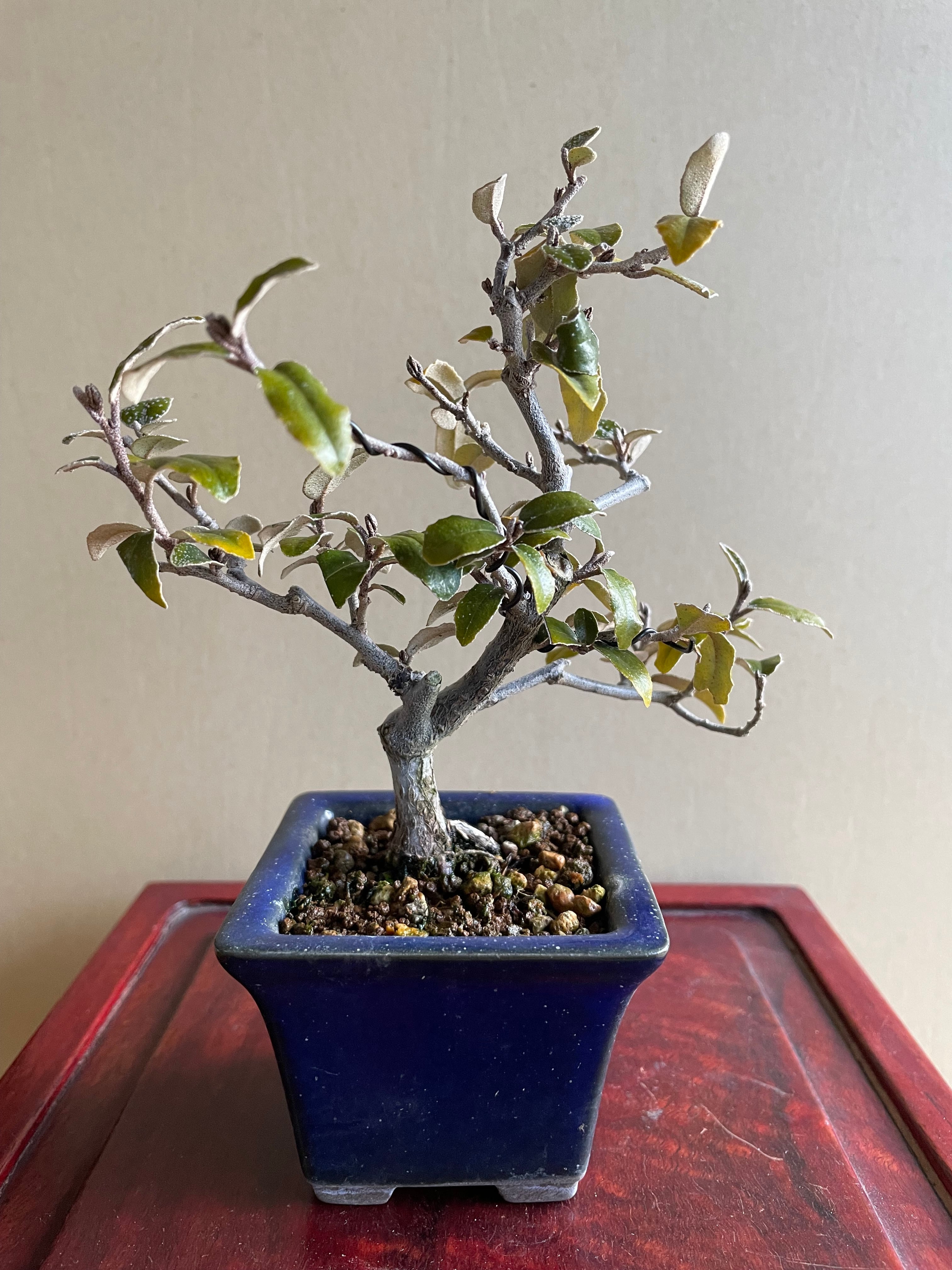 樹高12、木幅14cm、寒グミの盆栽です。寒グミの葉には白い小さな斑点状の斑が入っており、特徴的です。晩秋に花が咲き、冬に赤い実ができます(木や年によってばらつきがあります)。