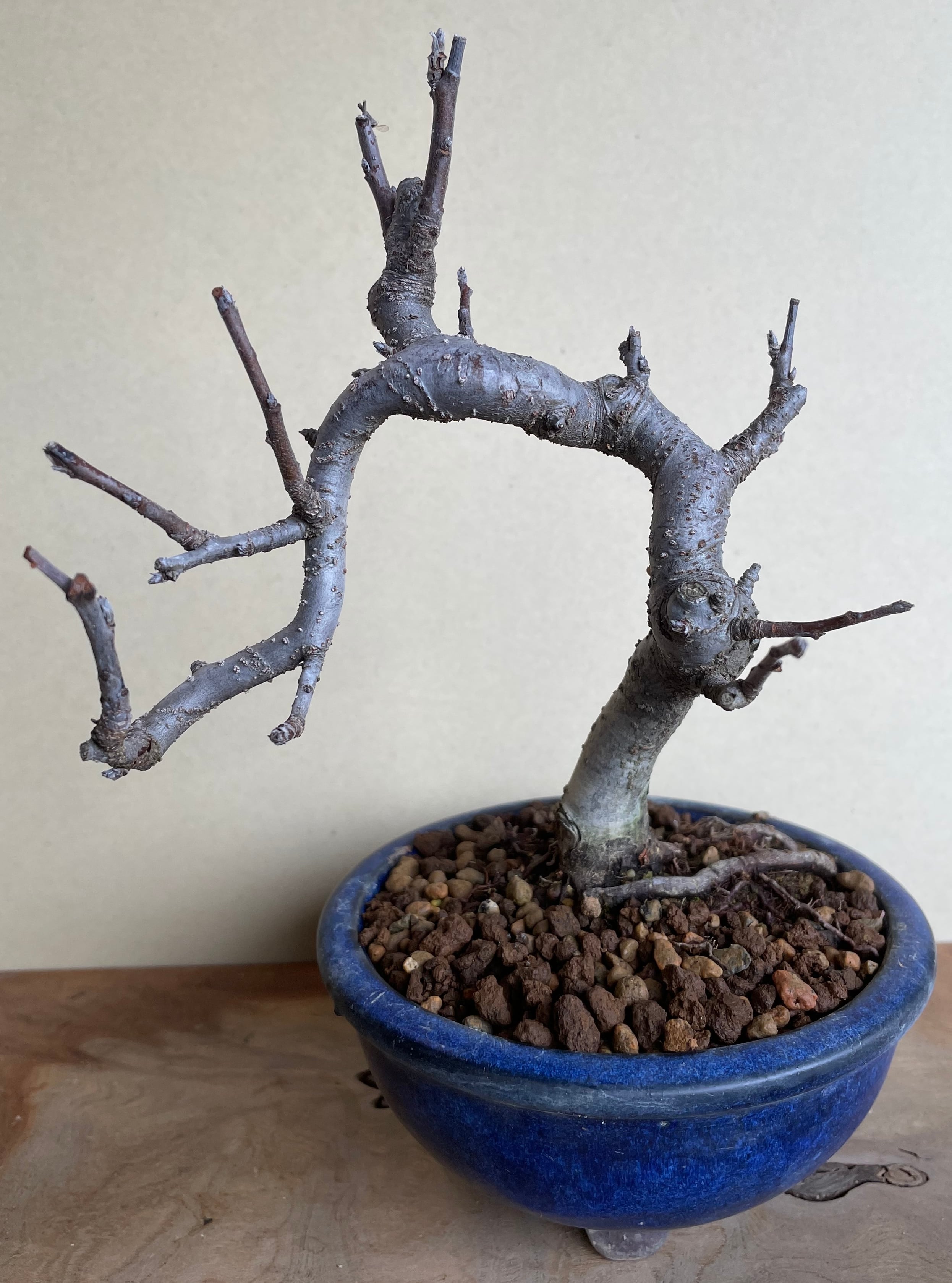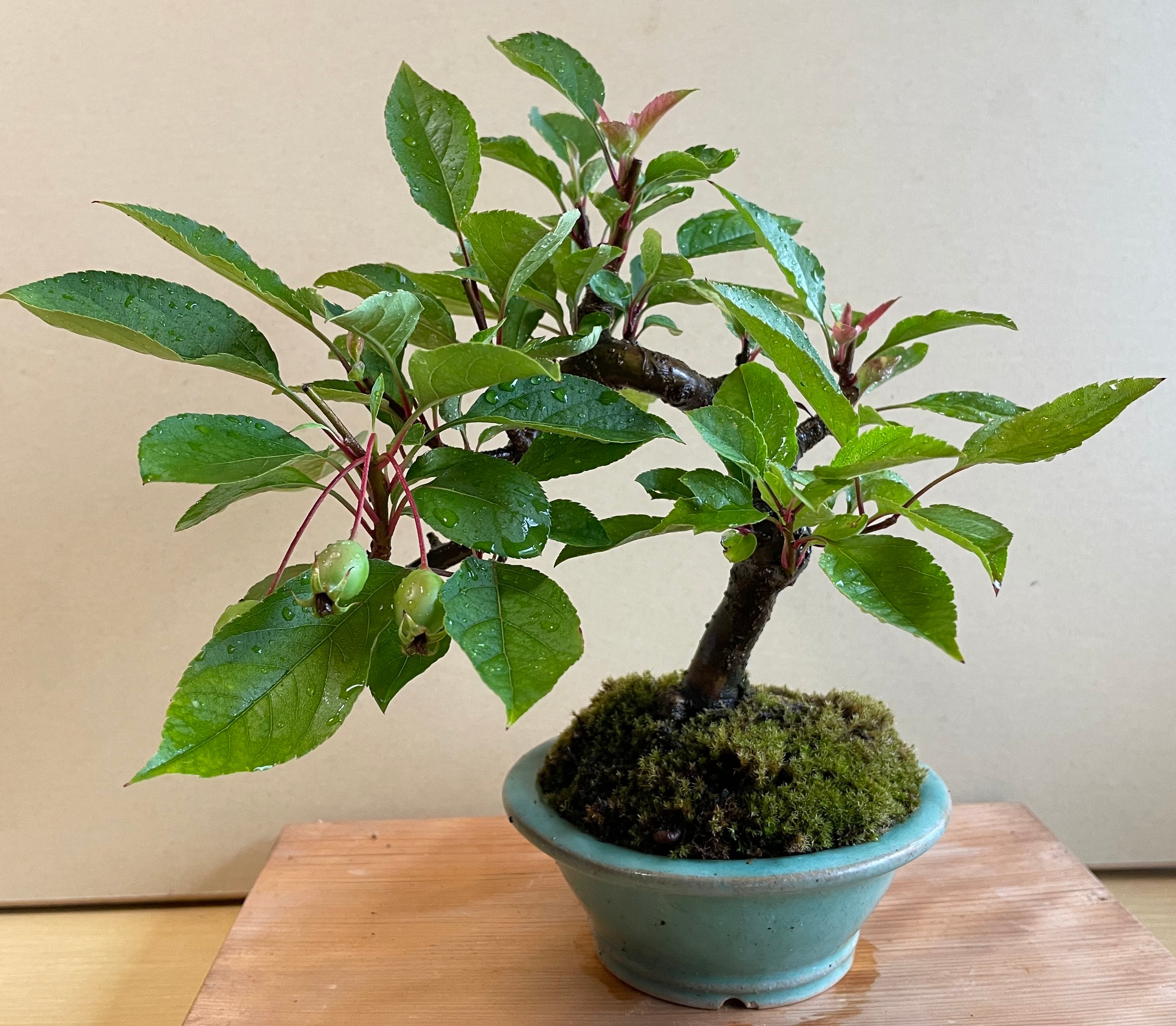 樹高16cm、木幅13cm、姫美好の盆栽です。深山海棠、姫りんごの品種ものです。春に白い花が咲き、秋に赤い実が成ります。写真は冬の落葉中の姿です。2枚目の写真は夏季の葉がある状態の写真です。結実には、深山海棠などの別品種との交配が必要です。