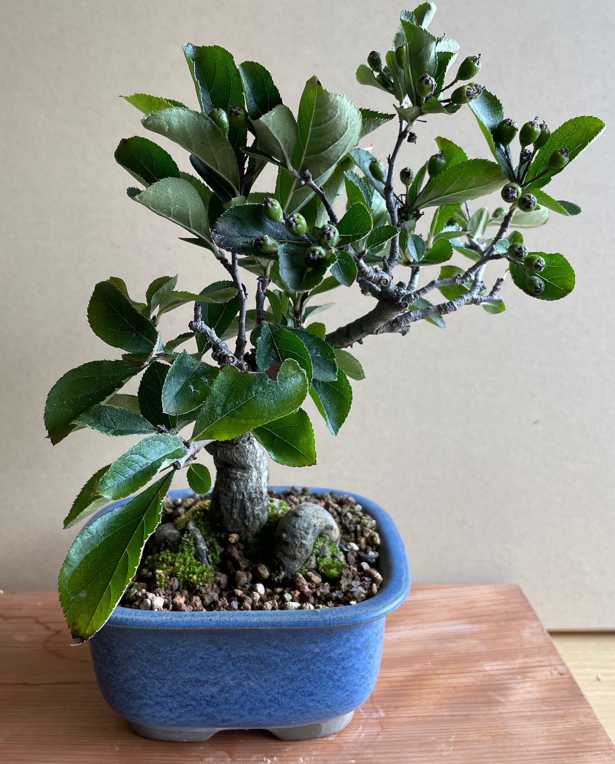 樹高18cm、木幅14cm、カマツカの盆栽です。実がついており、秋に赤くなります。秋には紅葉し、冬は落葉します。幹がどっしりしています。夏の日差しで、先が灼けている葉が数枚ありますが、鑑賞などには差し支えありません。根がコブ状になっており、好みが分かれるかもしれません。